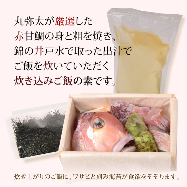 | 内容量 | 赤甘鯛250g、出汁400cc,ワサビ25g、刻みのり10g |